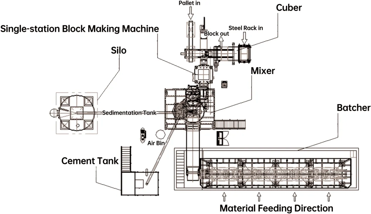 สายการผลิตบรรลุการกำหนดสูตรวัสดุที่แม่นยำผ่านระบบการผสมและการผสม วัสดุจะถูกลำเลียงผ่านสายพานและยกเข้าไปในเครื่องผสม โดยจะมีการผสมอย่างทั่วถึงก่อนที่จะถ่ายโอนไปยังเครื่องผสมวัสดุแบบหันหน้า โต๊ะกดหลักเลื่อนออก และในระหว่างการป้อนวัสดุบนพื้นผิว ถังจ่ายวัสดุจะกระจายวัสดุไปยังโครงแม่พิมพ์บนโต๊ะเลื่อนอย่างแม่นยำ จากนั้นโต๊ะจะเคลื่อนไปใต้กรอบกดเพื่อขึ้นรูปการกรองแบบกด ในขณะเดียวกัน พาเลทจะถูกส่งไปยังตำแหน่งรองของโต๊ะโดยตัวป้อนพาเลท ในระหว่างรอบการเติมครั้งถัดไป อิฐที่ขึ้นรูปแล้วจะถูกถอดออกโดยอัตโนมัติ ระบบจะทำการป้อนพาเลทและนำอิฐเปียกออกพร้อมกันในระหว่างกระบวนการกด เพื่อให้มั่นใจว่าการผลิตมีประสิทธิภาพและต่อเนื่อง