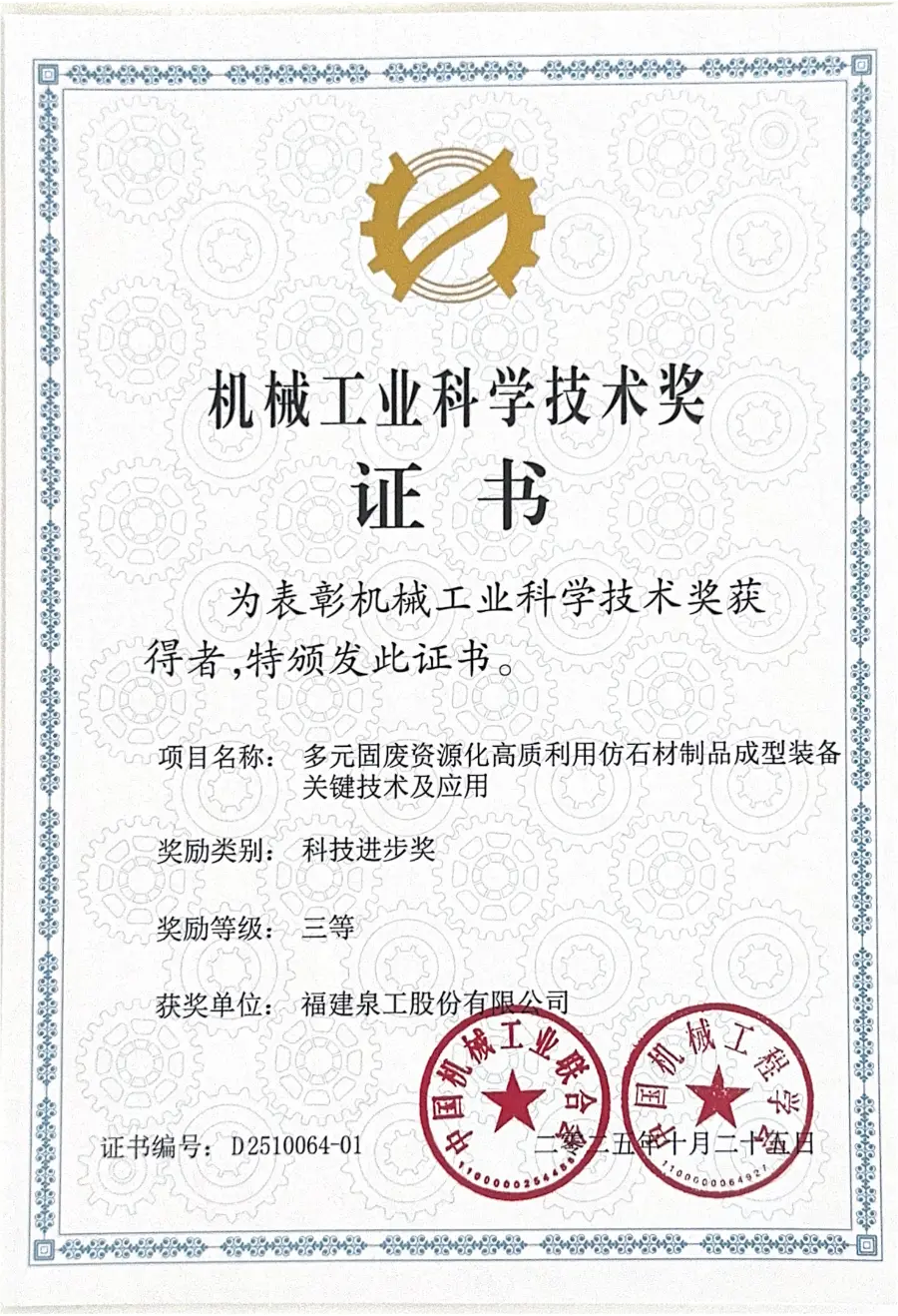 เมื่อเร็วๆ นี้ มีการประกาศรายชื่อผู้ชนะรางวัล China Machinery Industry Science and Technology Award ประจำปี 2025 อย่างเป็นทางการ โครงการ "เทคโนโลยีหลักและการประยุกต์ใช้อุปกรณ์การขึ้นรูปเพื่อการใช้ทรัพยากรขยะที่หลากหลายที่มีมูลค่าสูงในผลิตภัณฑ์หินจำลอง" ซึ่งนำโดย Fujian Quangong Machinery Co., Ltd. ได้รับรางวัลที่สามจากความก้าวหน้าทางเทคโนโลยี รางวัลนี้แสดงให้เห็นถึงการยอมรับอย่างสูงของQuangong เครื่องจักร Co., Ltd.ความสามารถด้านนวัตกรรมทางเทคโนโลยีและความสำเร็จในการใช้งานทางวิศวกรรมของในด้านการใช้ทรัพยากรขยะมูลฝอยที่มีมูลค่าสูงและอุปกรณ์การขึ้นรูปอัจฉริยะสำหรับผลิตภัณฑ์หินจำลอง