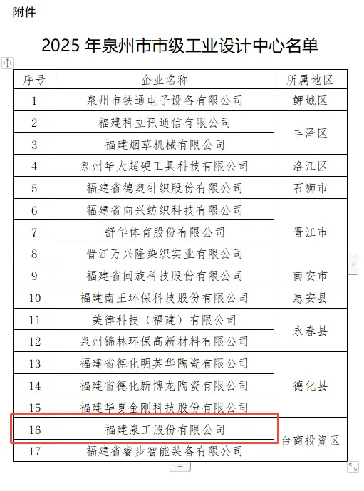 เมื่อเร็วๆ นี้ สำนักงานเทคโนโลยีสารสนเทศและอุตสาหกรรมของเมืองเฉวียนโจวได้เผยแพร่ "ประกาศเกี่ยวกับการเผยแพร่รายชื่อศูนย์การออกแบบอุตสาหกรรมระดับเมืองเฉวียนโจวในปี 2568" อย่างเป็นทางการ โดยมีบริษัททั้งหมด 17 แห่งที่จดทะเบียนในเมืองดังกล่าว หนึ่งในนั้นคือ Fujian Quangong Co., Ltd. ซึ่งมีส่วนเกี่ยวข้องอย่างลึกซึ้งในด้านเครื่องจักรอิฐอัจฉริยะและอุปกรณ์การใช้ขยะมูลฝอยอย่างครอบคลุม ได้รับการคัดเลือกอย่างประสบความสำเร็จจากประสิทธิภาพที่โดดเด่นในด้านนวัตกรรมการออกแบบอุตสาหกรรม การสร้างระบบการวิจัยและพัฒนา และการเปลี่ยนแปลงความสำเร็จ