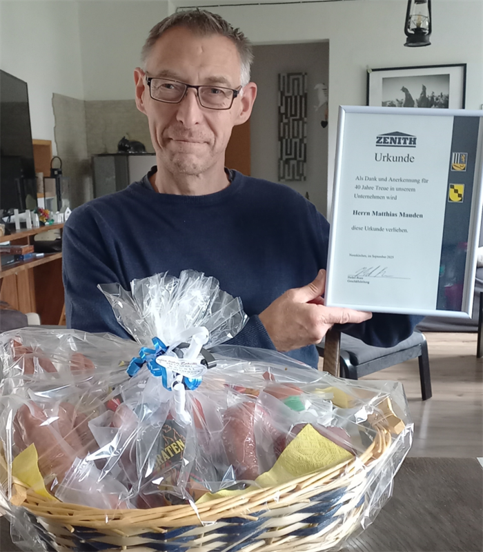 นายแมทเธียส เมาเดน อายุ 57 ปี ร่วมงานกับซีนิธนับตั้งแต่สำเร็จหลักสูตรการฝึกอบรมช่างประกอบเครื่องกลเป็นเวลาสามปี ในช่วงหลายปีที่ผ่านมา เขาทำงานในสาขาวิศวกรรมไฮดรอลิก โดยมีความเชี่ยวชาญอย่างลึกซึ้งในด้านกระบอกไฮดรอลิกและเครื่องสั่น ในเวลาเดียวกัน เขายังทำหน้าที่ปฐมพยาบาลเบื้องต้นในบริษัทอย่างจริงจัง เพื่อให้มั่นใจในความปลอดภัยของเพื่อนร่วมงาน การอุทิศตนเป็นเวลาสี่สิบปีของเขาได้เห็นการเดินทางอันยอดเยี่ยมของการเติบโตเคียงข้างเซนิธ