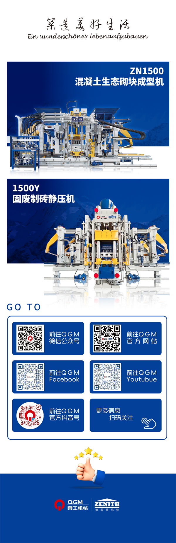 ในฐานะแบรนด์ชั้นนำในอุตสาหกรรมเครื่องทำอิฐในประเทศ QGM ได้รับการจัดอันดับให้เป็นหนึ่งในองค์กรชั้นนำใน Quanzhou มาอย่างต่อเนื่องเป็นเวลาหลายปี ปัจจุบันบริษัทได้รับสิทธิบัตรผลิตภัณฑ์มากกว่า 300 ฉบับ โดย 21 ฉบับเป็นสิทธิบัตรการประดิษฐ์ที่ได้รับอนุญาตจากสำนักงานทรัพย์สินทางปัญญาของรัฐ ในปี 2014 บริษัทได้เข้าซื้อกิจการ Zenith ซึ่งเป็นผู้ผลิตเครื่องจักรผลิตอิฐไร้พาเลทที่มีชื่อเสียงระดับโลกในเยอรมนีซึ่งมีประวัติยาวนานกว่า 60 ปี โดยสมบูรณ์ โดยเปิดตัวการขยายเชิงกลยุทธ์ทั่วโลกอย่างเป็นทางการ ด้วยการบูรณาการเทคโนโลยีขั้นสูงของเยอรมันอย่างเต็มรูปแบบและใช้ประโยชน์จากประสบการณ์การผลิตที่สั่งสมมานานหลายทศวรรษ QGM จึงสามารถคิดค้นและพัฒนาโมเดลระดับไฮเอนด์ที่สามารถแข่งขันระดับนานาชาติได้อย่างต่อเนื่อง ผลิตภัณฑ์เหล่านี้ถูกส่งออกไปยังกว่า 60 ประเทศและภูมิภาคตามโครงการริเริ่มหนึ่งแถบหนึ่งเส้นทาง ซึ่งได้รับการยอมรับอย่างสูงในตลาดโลก
